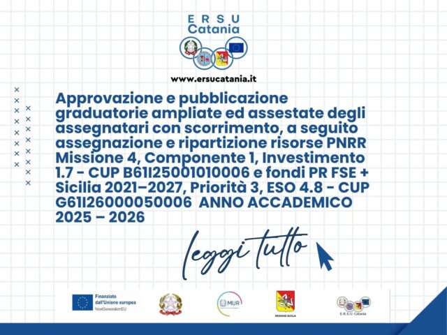 La Carta dei Servizi ERSU Catania 2025/2026 è uno strumento informativo rivolto agli studenti per orientarsi tra benefici e servizi dedicati al diritto allo studio …