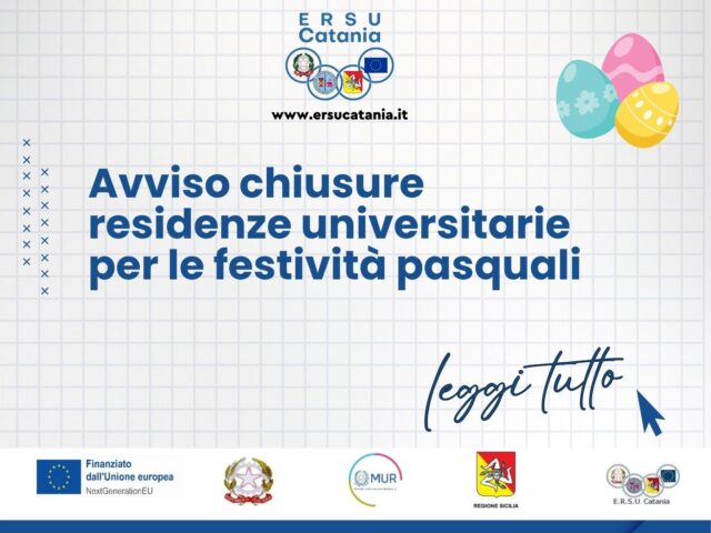Si informa l’utenza studentesca che gli uffici direzionali dell’ERSU di Catania, di via Etnea n°570 CT, saranno chiusi l’intera giornata del 03/04/2026 per le consuete operazioni di disinfestazione e derattizzazione.