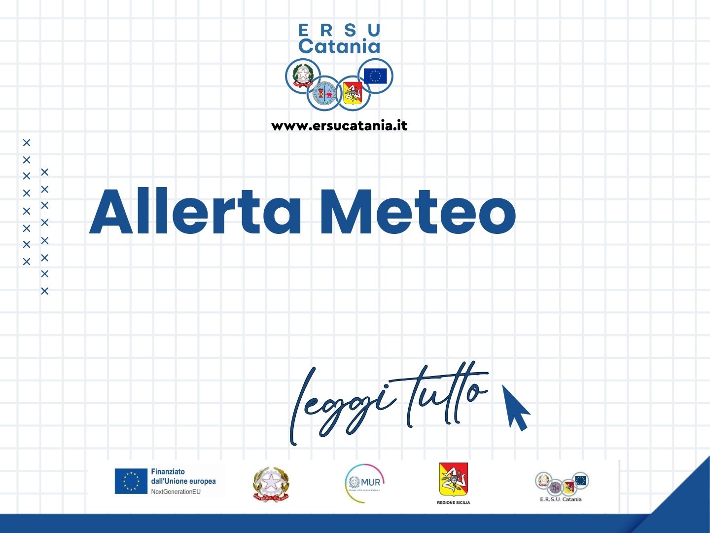 Si avvisano gli studenti che, a causa delle avverse condizioni meteorologiche e al fine di garantire la sicurezza degli utenti, nella giornata del 16/03/2026 le aule studio “Centro” di via Carrata n. 24, “Toscano Scuderi” di via Etnea n. 436 e “Cittadella” di via Santa Sofia n. 64 rimarranno chiuse.