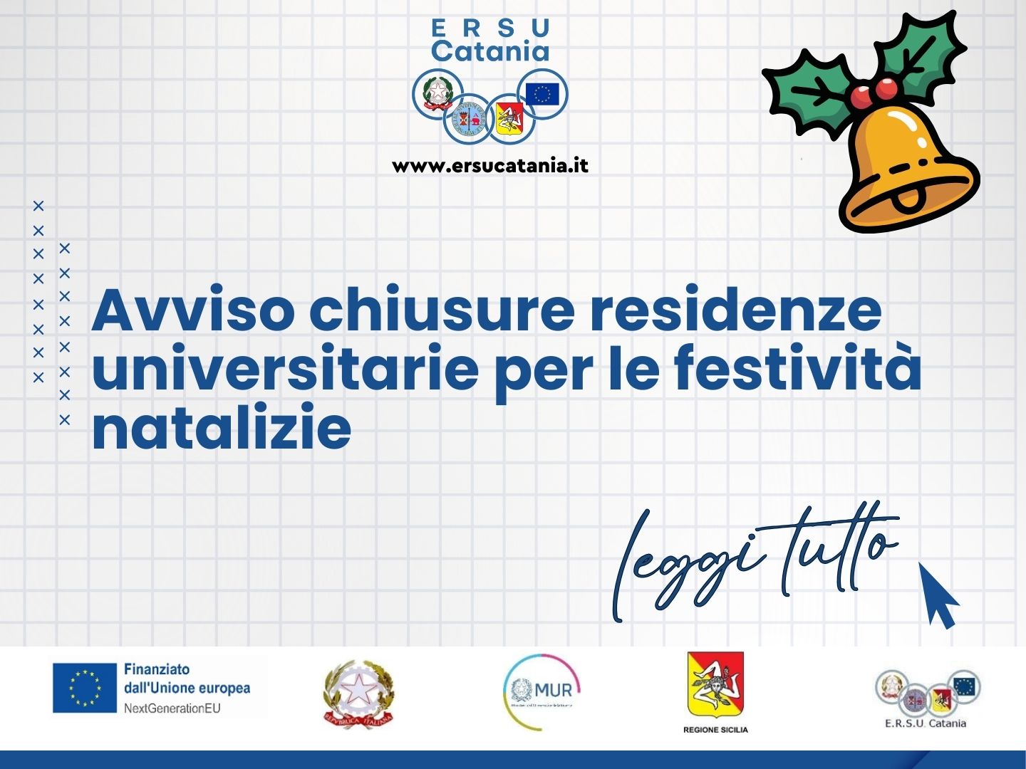 Pertanto tutti gli studenti a qualsiasi titolo alloggiati nelle residenze universitarie gestite dall’Ersu di Catania, dovranno obbligatoriamente lasciare le stanze libere da tutti gli effetti personali entro le ore 9:00 del 19/12/2025.