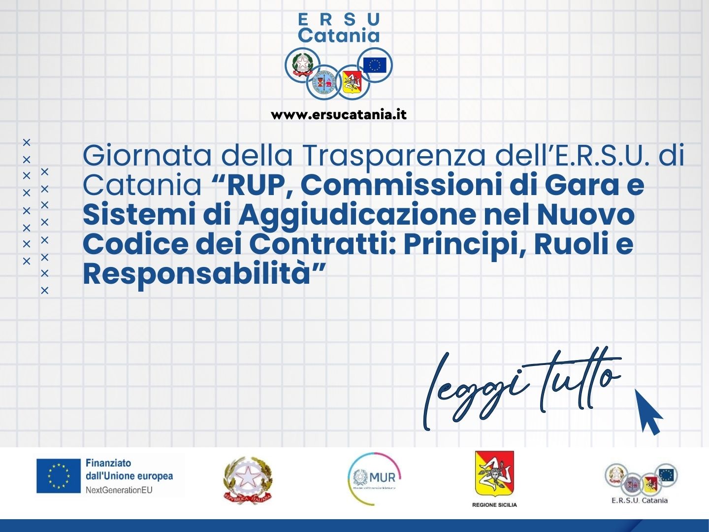 Mercoledì 3 Dicembre 2025, dalle ore 9:30 alle ore 13:00, si terrà, presso l’Aula Consiliare degli Uffici Amministrativi dell’Ente, in via Etnea n. 570 – Catania, la Giornata della Trasparenza 2025 dell’ERSU di Catania.